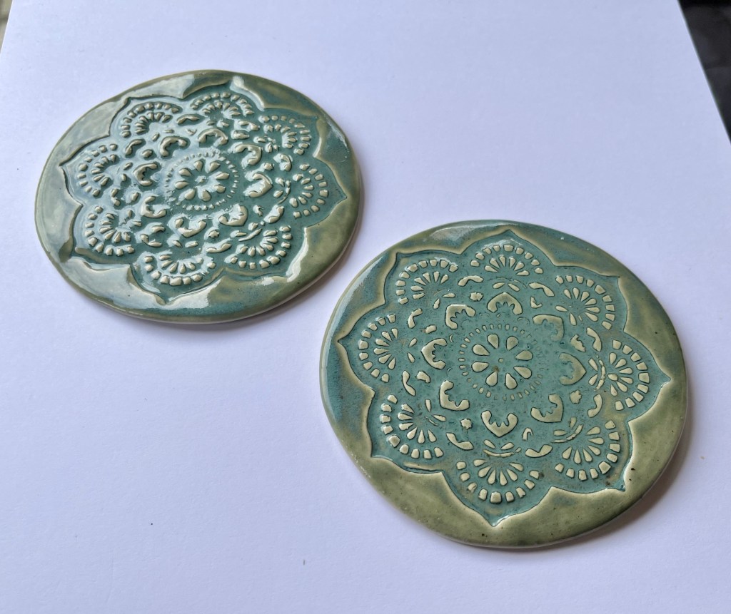 I made quite a few of these coasters, using different stencils and coaster shapes. These two are my favourite and the only ones that I feel are properly nice enough to sell/gift to someone.