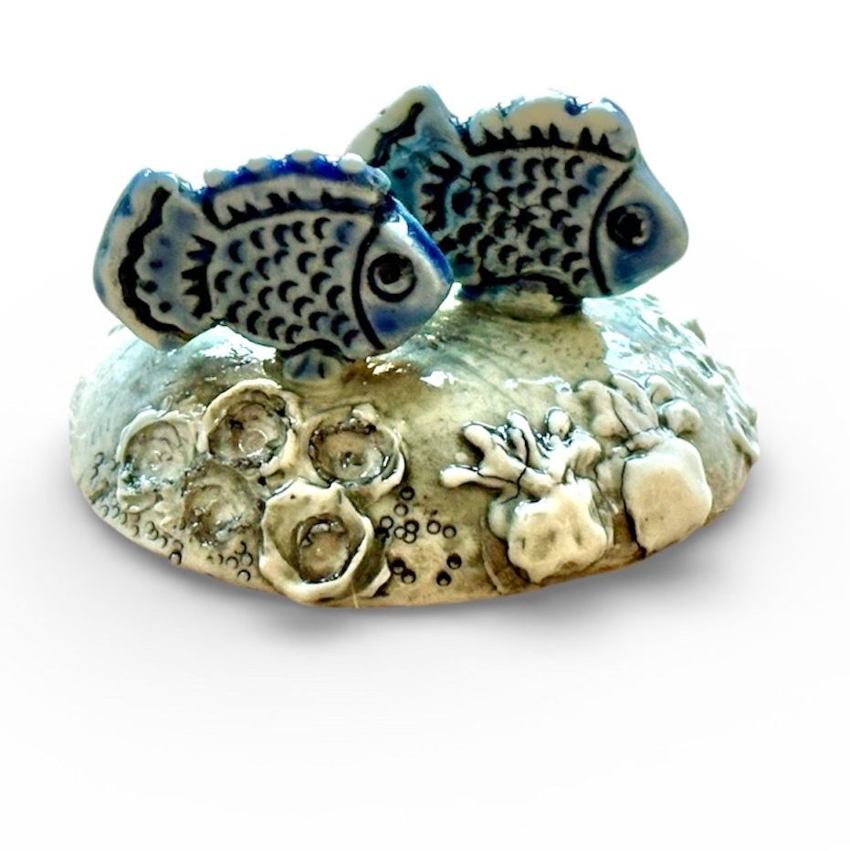 Two tiny hand-built porcelain fish sit together on a coral-textured base, each one detailed with scales and inky blue markings. Muted tones settle into the textured surface and highlight the reef-like forms below. A small, characterful piece reflecting quiet moments beneath the sea.