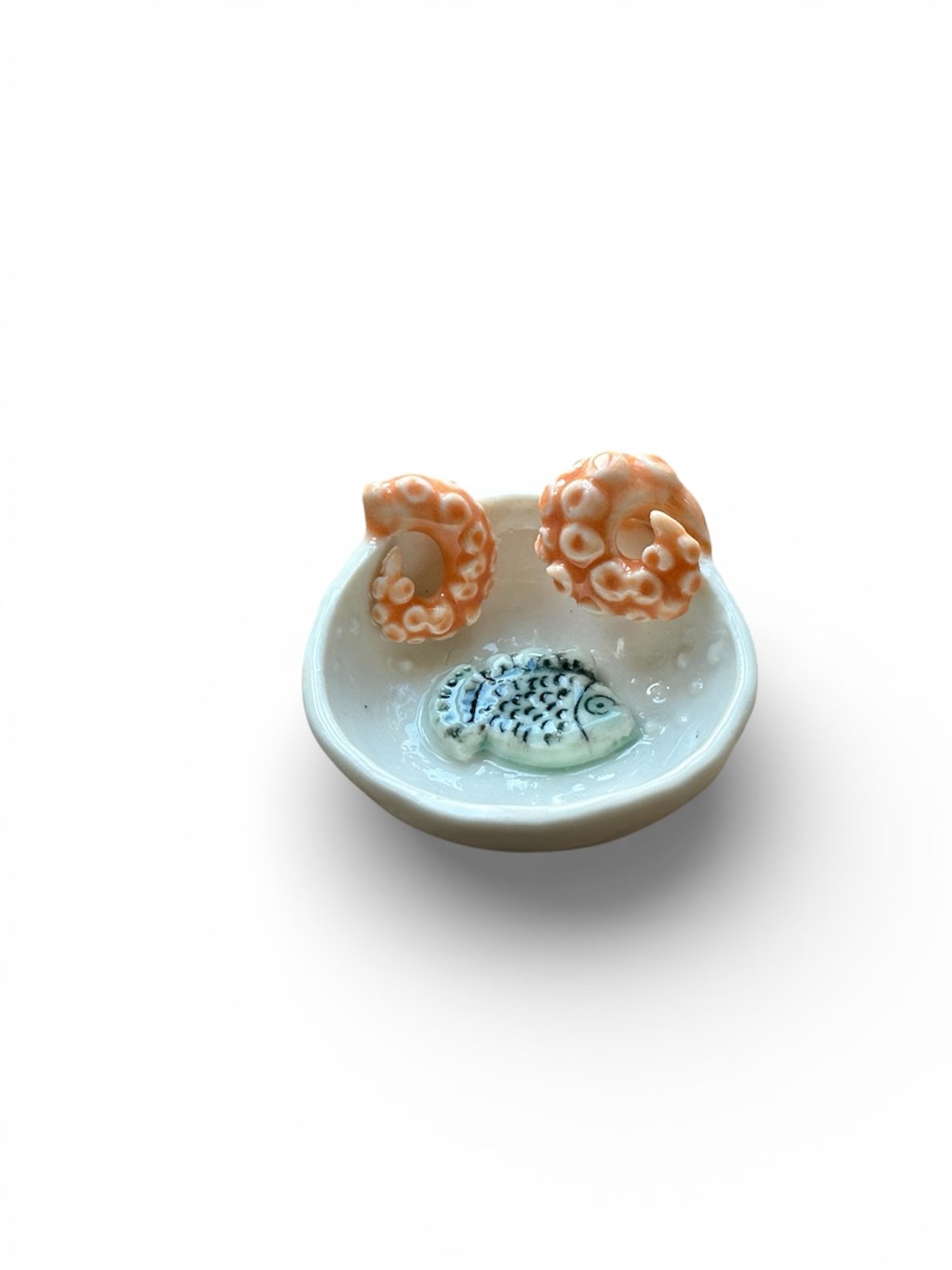 Miniature hand-made porcelain fish sculptures. Each piece is finished with individual details and textures. Variations in surface textures and colour makes every piece unique.
