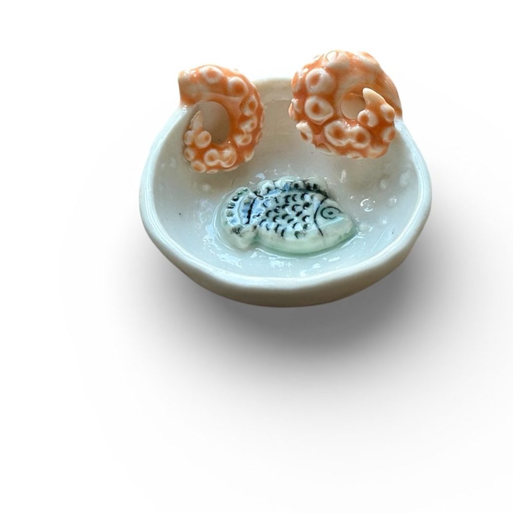 A small hand-made porcelain dish with a tiny fish nestled inside, framed by raised octopus legs around the rim. Soft white glaze is paired with warm coral-orange accents and subtle blue-grey markings. A charming, coastal-inspired piece.